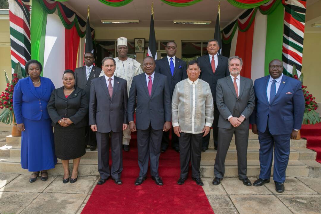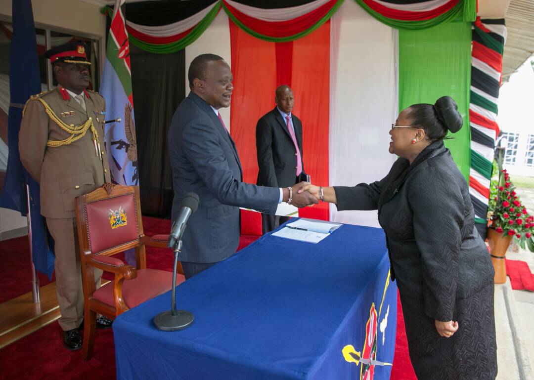 Balozi wa Tanzania nchini Kenya, Mhe. Dkt. Pindi Hazara Chana akisalimiana na Rais wa Jamhuri ya Kenya, Mhe. Uhuru Kenyatta kabla ya kuwasilisha Hati za Utambulisho kwenye Ikulu ya Eldoret tarehe 13 Juni 2017.
